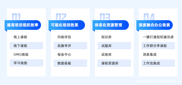 与泛微平台进行深度融合,将学习融入到办公场景和日常工作当中,一键打通组织通讯录,通过工作群分享课程,实现消息集成、工作流集成,提高员工在学习上的互动性,缩短学习成果转化链条。